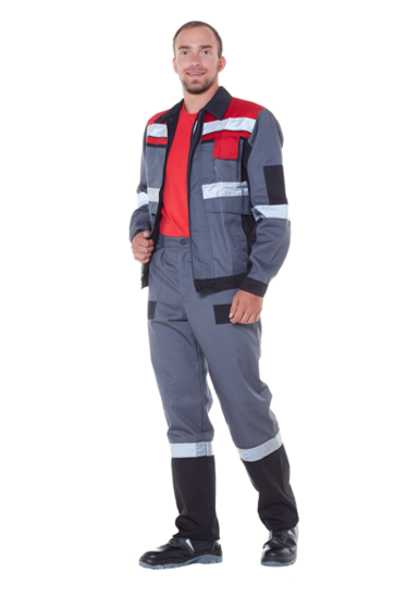 Сочетание основного серого цвета костюма с красными и черными вставками делает его эффектным и одновременно не марким, удобный прямой фасон оставляет свободу движениям, а светоотражающие полосы увеличивают видимость при недостаточном освещении.